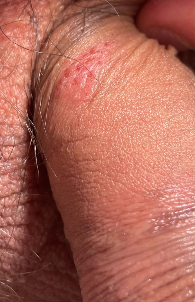 사진상 발적을 동반한 피부 병변의 과각화와 함께 딱지가 관찰되고 있어 습진과 같은 국소 피부염이 발생하였고 가려움으로 인하여 손으로 긁으면서 상처가 발생한 후 딱지가 형성된 것으로 추정됩니다. 이러한 병변은 성병의 대표적인 질환인 헤르페스 감염이나 곤지름에서 관찰되는 수포성 병변이나 사마귀 양상의 결절성 변변이 아니므로 성병 가능성은 낮습니다. 국소 스테로이드 제재 등을 이용한 치료가 필요하므로 피부과나 비뇨의학과 내원하여 진료를 보시는 것을 권해드립니다.