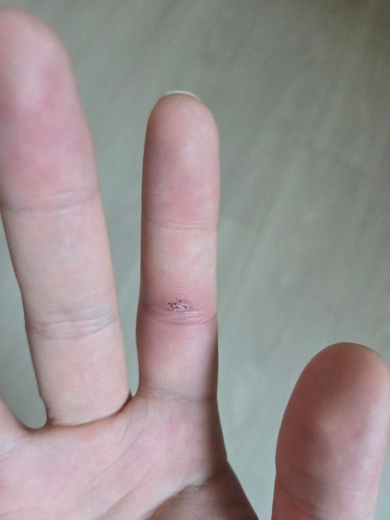 다음 소견이 있으면 즉시 응급실 권고합니다. 점점 심해지는 부종·통증, 상처 주위 발적 확대, 열감, 고름, 발열, 손가락을 약간 구부린 자세에서 통증이 심하고 수동 신전 시 심한 통증(굴곡건 건초염 의심), 감각 저하. 현재 기술만으로도 응급실 가십시오.