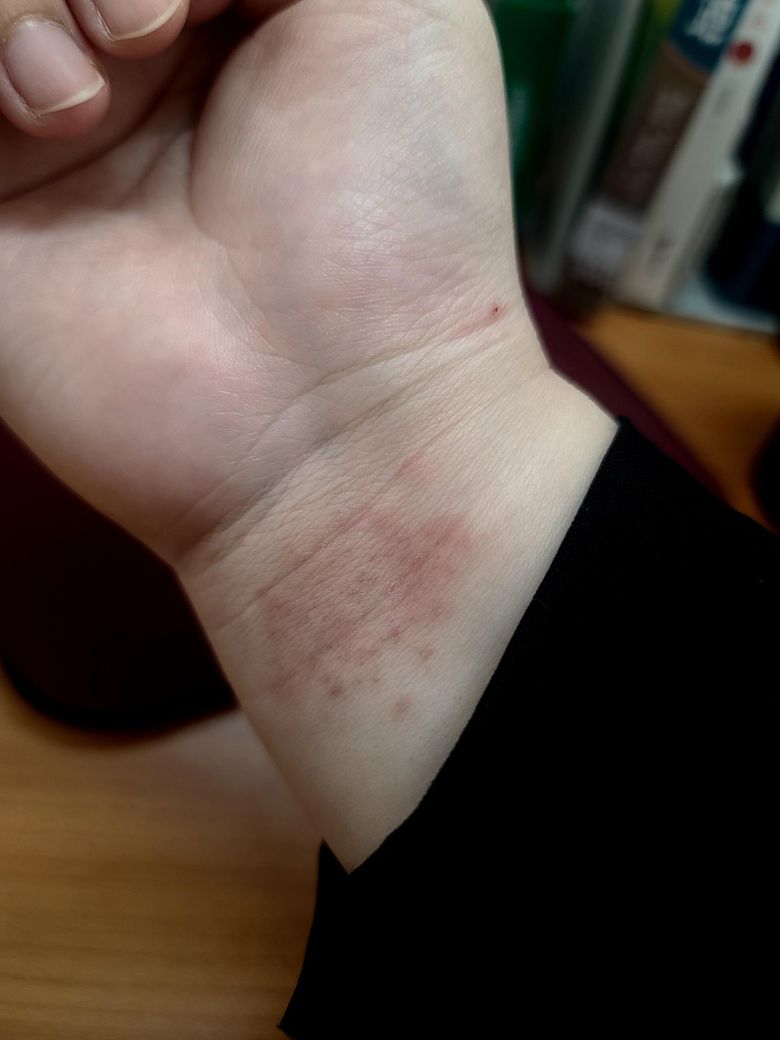 며칠 전부터 범위가 좀 커지더니 울긋불긋하고 피부가 살짝 까졌네요