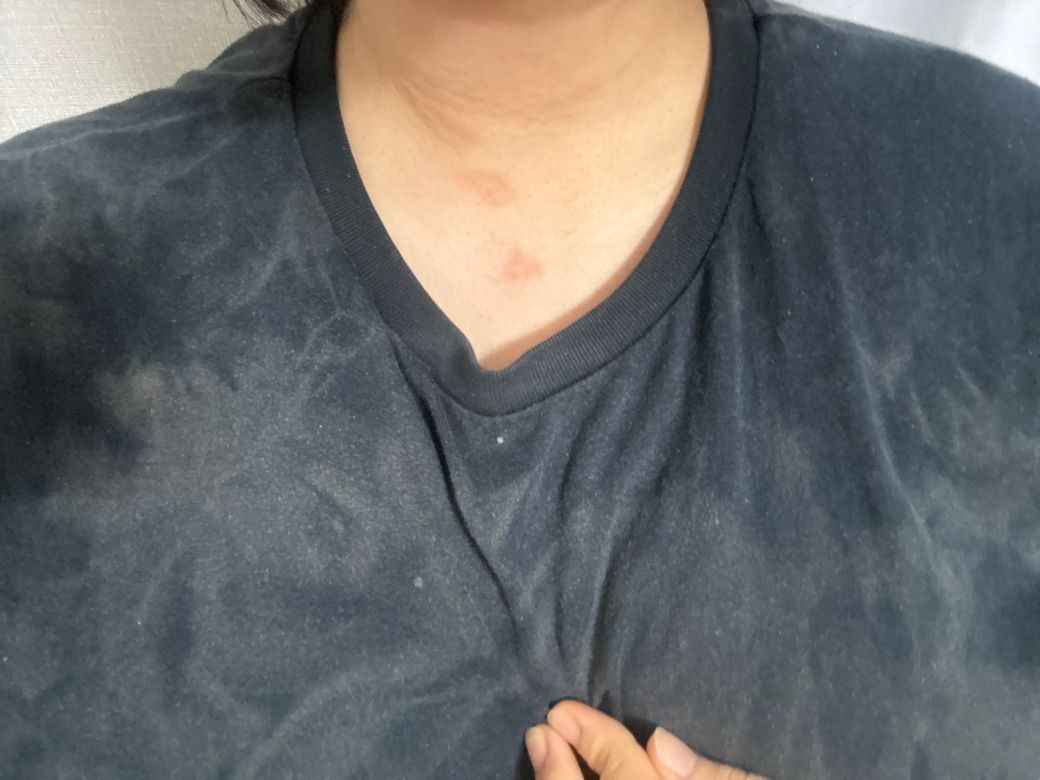 사진상 쇄골 부위에 경계가 비교적 불분명한 홍반성 반점이 2–3개 정도 보이며, 융기나 농포는 뚜렷하지 않습니다. 한 달 이상 지속되고 옅게 남아 점차 고정된 양상이라는 점에서 일시적 혈관 반응보다는 국소 피부 질환 가능성을 우선 고려합니다.