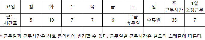 * 근무일과 근무시간은 상호 동의하에 변경할 수 있다. 근무일별 근무시간은 별도의 스케줄에 따른다.