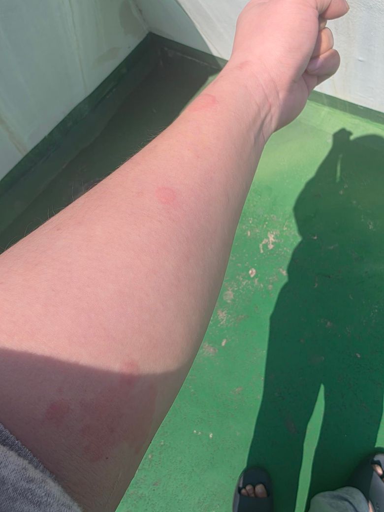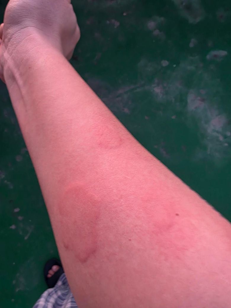 사진상 팽진 형태의 홍반이 군데군데 보이고, 이동성으로 발생했다는 점을 고려하면 급성 또는 아급성 두드러기 양상으로 판단됩니다.