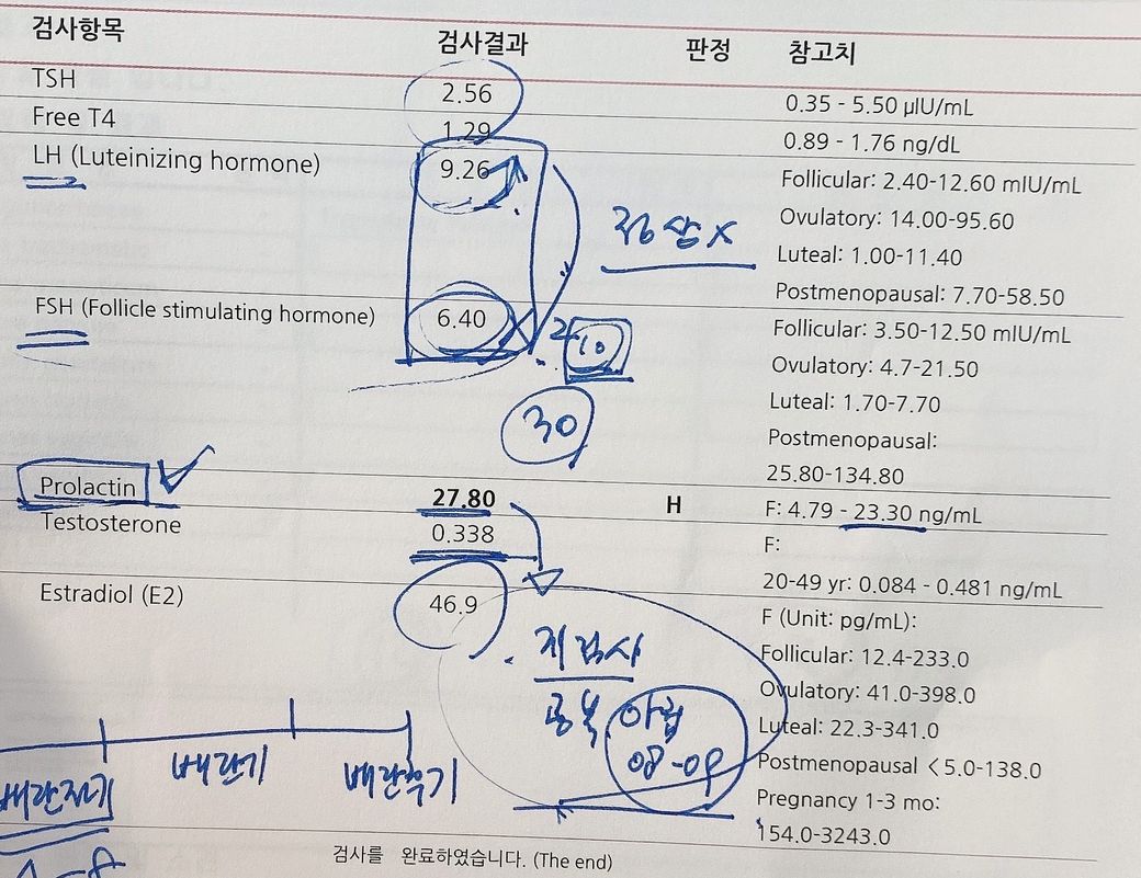 그래서 피검사를 진행했고 그에 대한 결과는 사진과 같이 나왔습니다. 저는 생리 양이 너무 적어서 조기폐경일까봐 걱정했는데 피검사 결과 일단 조기폐경은 아닌 것 같다고 하셨구요