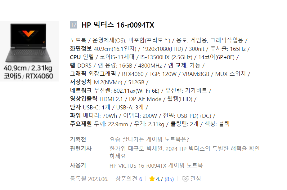아래는 다나와에서 본 hp 빅터스