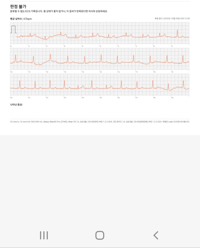 이전에도 답변드린바와 같이 워치의 심전도는 정확도가 떨어질뿐 아니라 접촉이 흔들리면서 심전도가 기록된 상태로 병원을 방문하여 표준 12 유도 심전도나 홀터검사를 권유 드립니다.