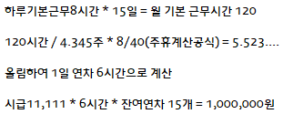 1일 연차수당 : 11,111 x 6.628 = 73,643원