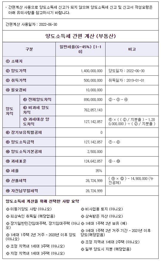 이것은 국세청 홈텍스 <양도세 미리 계산해 보기>를 통해 금액을 가정하여