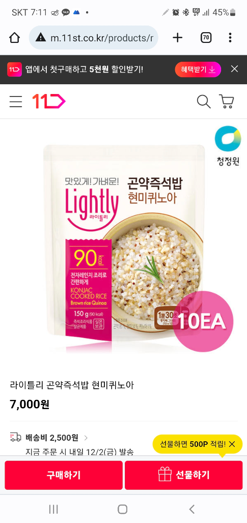 12월 1일 목요일 저는 인터넷 커머스 11번가에서 위와같은 페이지에서 제품을 구매하였습니다. 사진과같이 10개 7000원에 판매하고있었죠. 청정원공식홈페이지에서는 낱개 2000원정도에 팔고있었던 상품이라 유통쪽에서 할인하여 10개에 7000원에 파는줄알고 구매했습니다 약 24묶음정도.