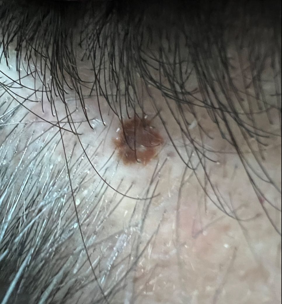 안녕하새요 오른쪽 두피라인에 점이 한 3년전에 생겼는데 지루성 두피염인지는 모르겠지만 점 주변으로 가끔씩 가렵고 빨갛게 올라옵니다. 이 갈색 부분을 누르면 다른부위와 다르게 살짝 들어가기도 합니다. 크기는 3년전과 동일한데 피부암일까 해서 질문드립니다. 맨 밑의 사진은 1년전에 찍어놓은 사진입니다.