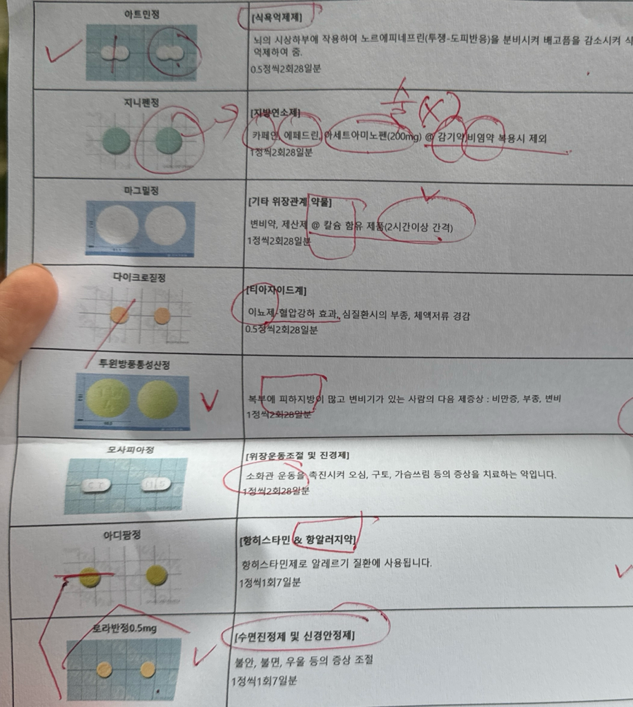 문의주신 사진의 피부과약들과 다이어트약들은 서로 성분이 중복되거나 상호작용이 있지 않기에 함께 복용을 하셔도 괜찮습니다.