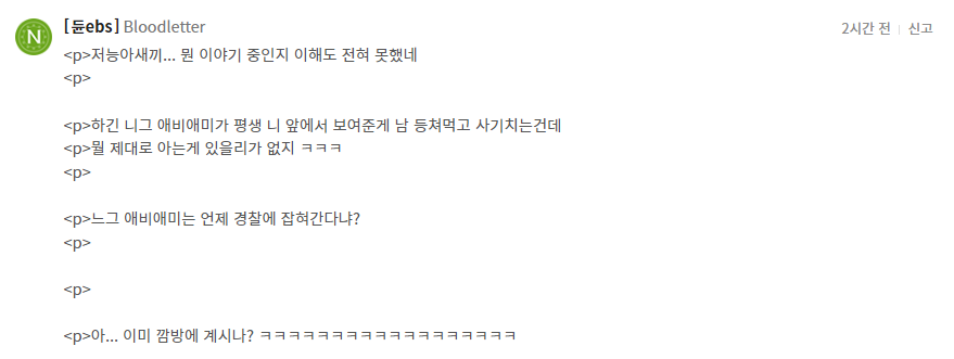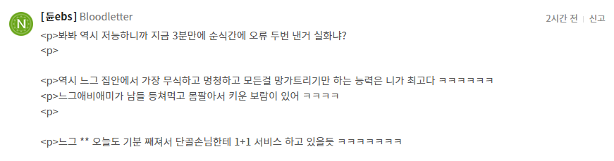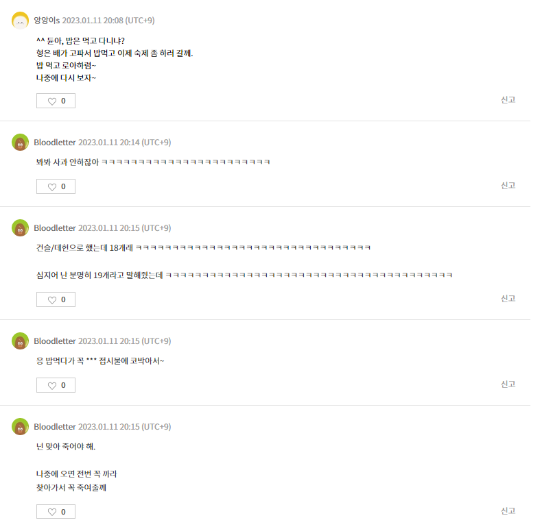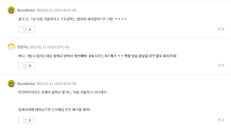 세 분류 다 각자의 글에서 둘만 계속해서 대화하고 있습니다. 상대방이 지속적으로 상대방을 폄하, 또는 비속어를 쓰고 있는데 고소가 안될까요?