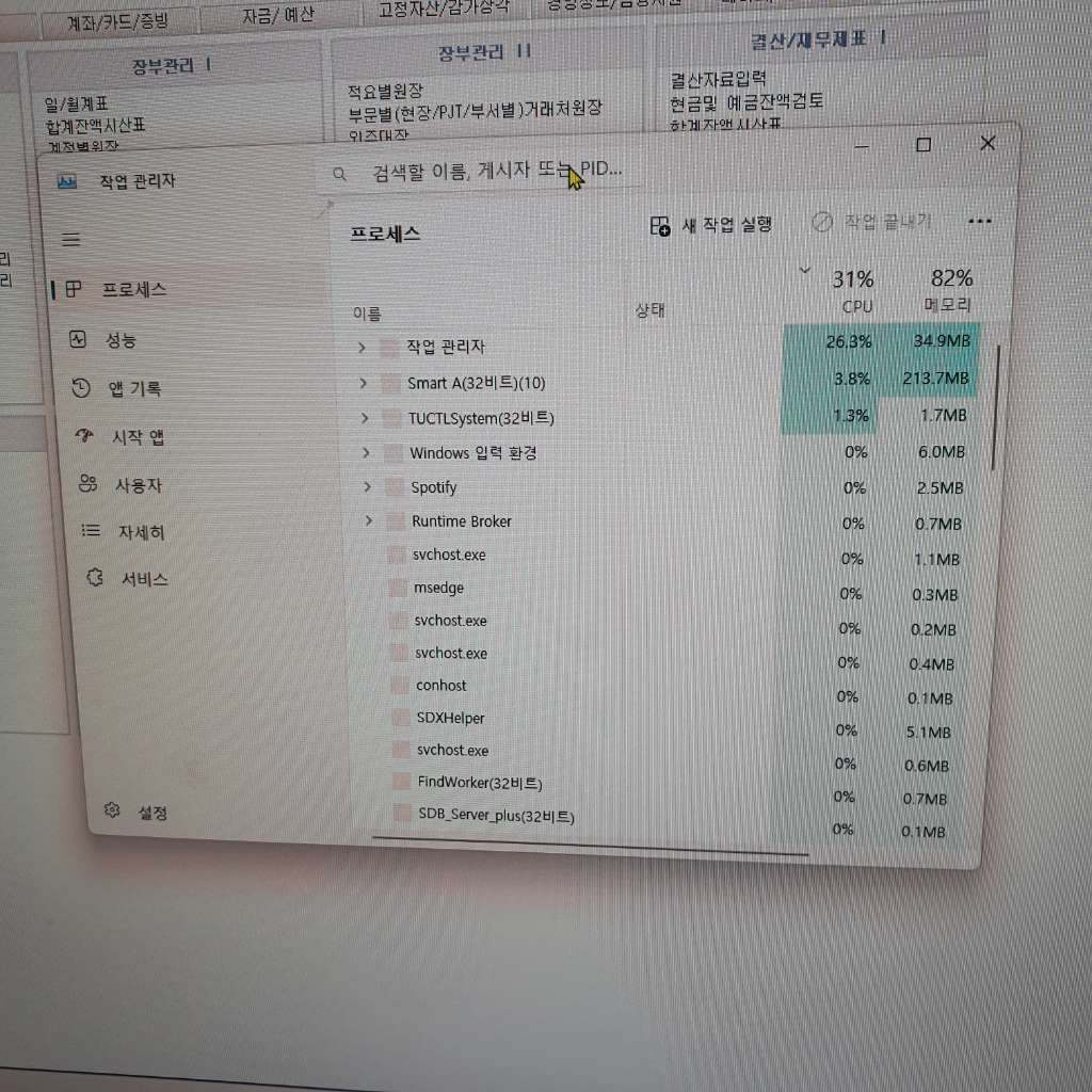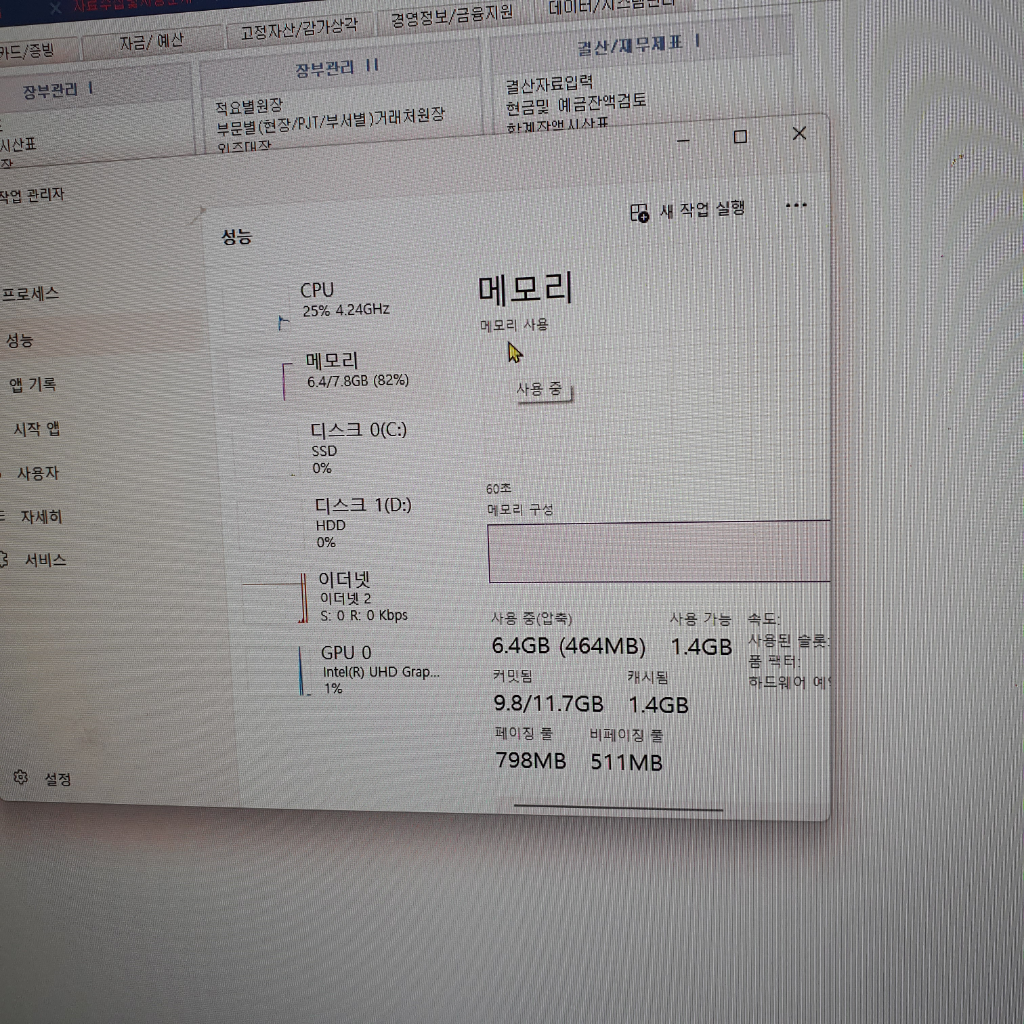 일단 사진 상으로 봤을 땐 메모리(램) 사용량이 높고 탑재된 램도 8GB 밖에 되지 않습니다