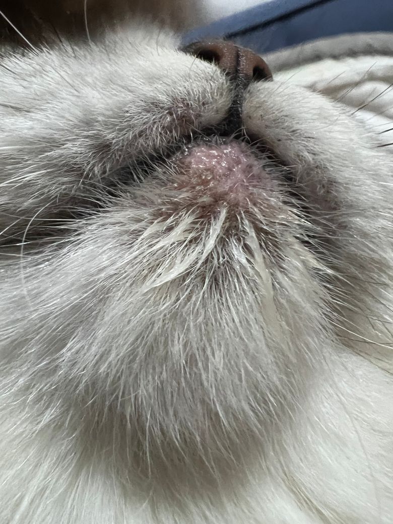 제모기로 아래턱의 털을 조심히 제거한 다음에 해당 부분 소독 및 연고(후시딘, 에스로반 계열) 도포해주시면 개선되는 경우가 많습니다.