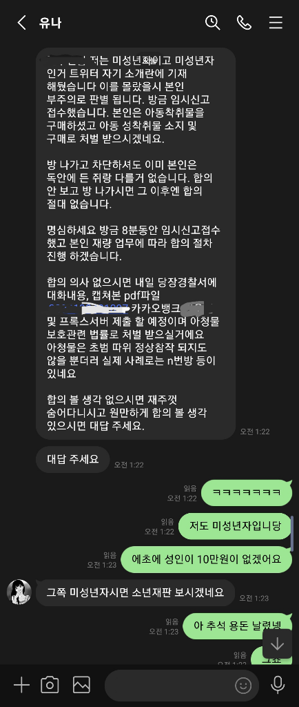 대화내용은 다 캡쳐해서 올린거구요. 진짜로 미성년자인지는 몰랐습니다. 실제로 20대지만 당황해서 10대라고했습니다. 또한 트위터 프로필에 미성년자라고 적었다고했으나 그런건 없었습니다. 전 어떻게 하면 되나요?