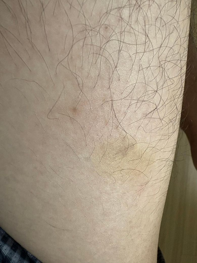 피부 허벅지에 살짝 옅게 누르스름한 부분이 생겼는데 멍일까요?