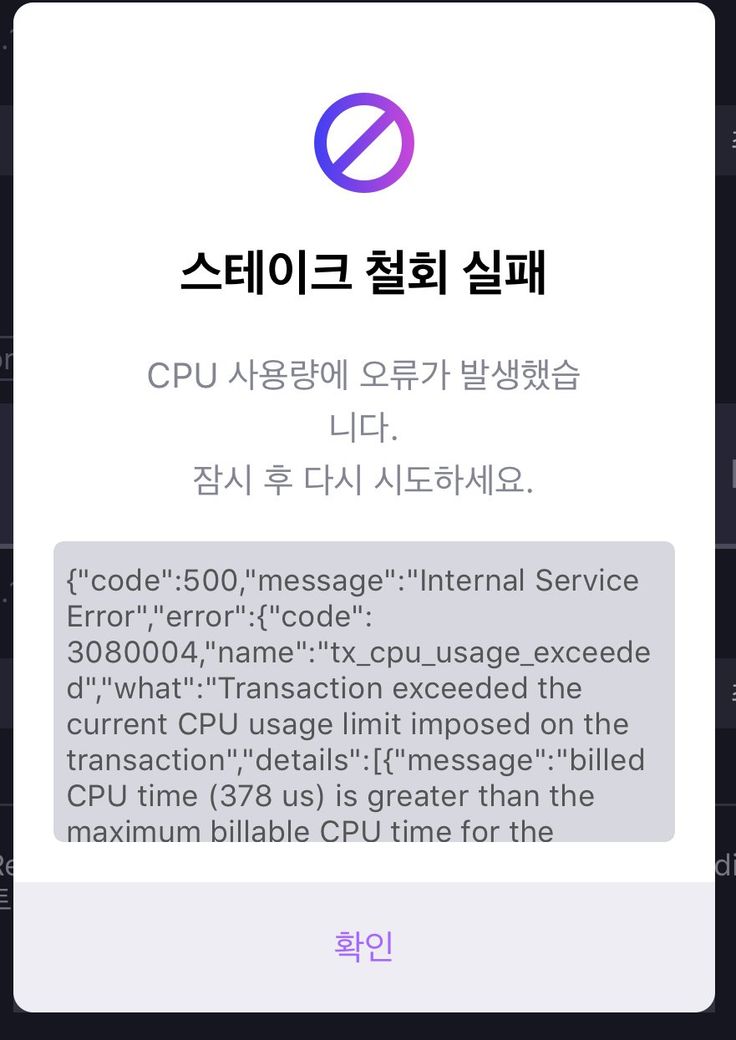 최근 이오스 생태계는 cpu자원부족으로 문제가 많이 발생을 하고 있습니다. EIDOS채굴이후 많은 유저들이 고생을 하고 있는데요. 저 또한 똑같은 오류를 접하고 있습니다. 최근 이오스 지갑에 있는 스테이킹을 해제할때도 아래와 같은 오류가 나고 있고 지갑에서 다른 지갑으로 또는 거래소로 전송시도 cpu부족 에러가 나고 있습니다.