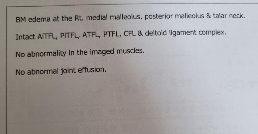 현재 올려주신 mri 결과는 부종 소견외에는 특별한 이상 증상이 없어 발목에 다른 특별한 문제가 없어