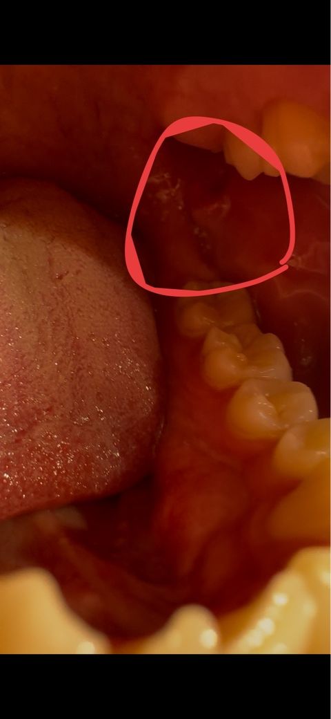 씹혀서 생긴 외상성궤양같습니다. 아무래도 위 사랑니가 맞닿는 치아 없이 그냥 잇몸과 볼쪽에 쌩으로 닿으니 거기가 자극되어 상처가 난 것입니다. 오라메디 발라주세요.