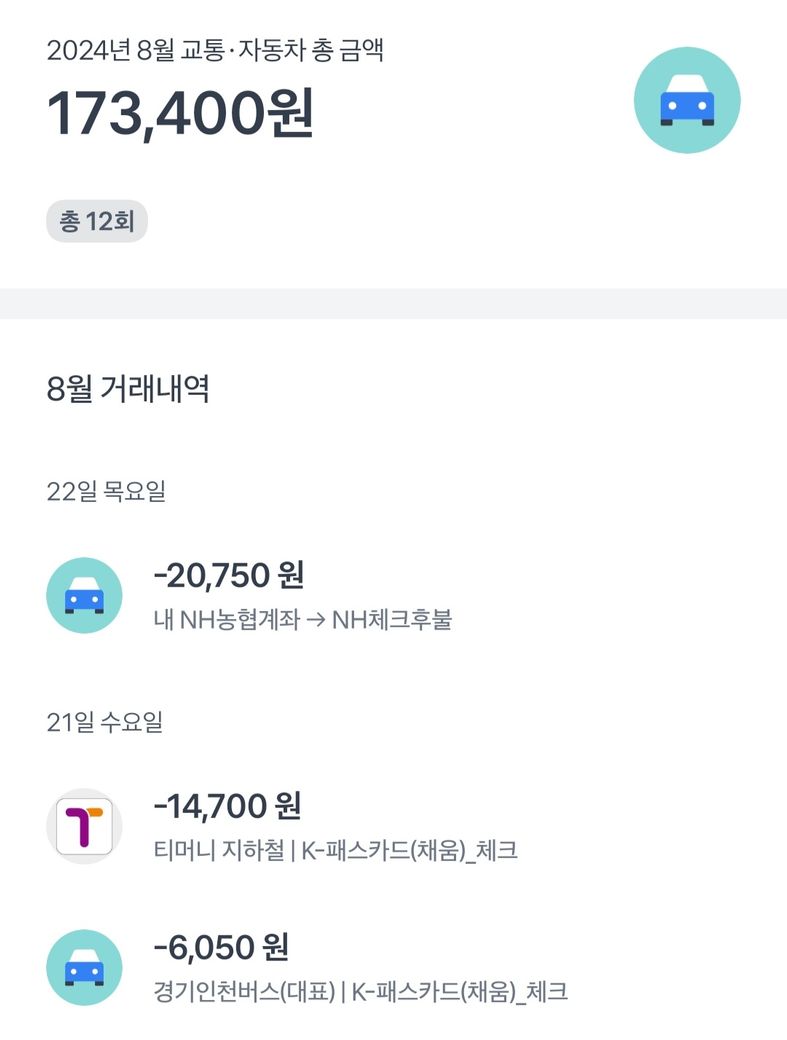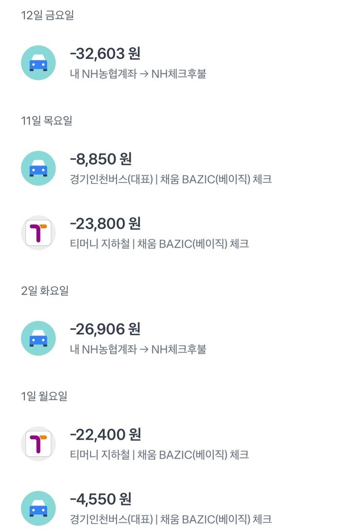 근데 전 지하철, 버스비 따로 체크카드로 돈이 나가고 다음날 계좌에서 합친 값이 또 나가요