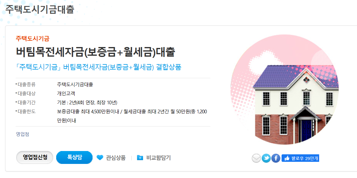 버팀목전세자금대출 중에서도 월세로 납부하는 월세+보증금 대출 진행가능한 상품이 있으며 아래 사진 참고해주세요