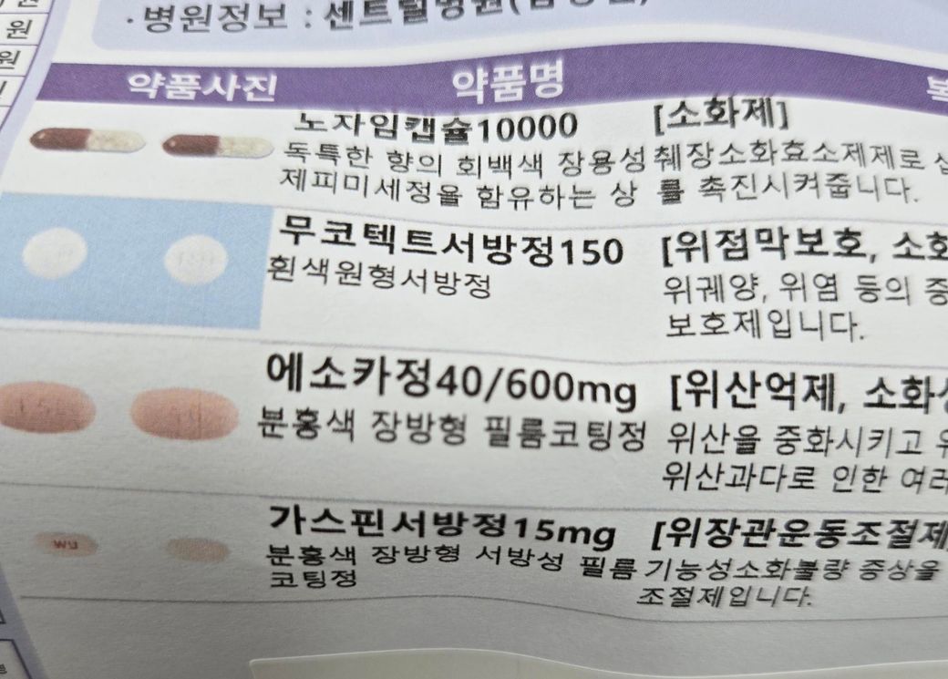 사진의 약은 소화효소제(노자임캡슐), 위점막 보호제(무코텍), 제산제/위산억제 복합제(에소카정), 위장관운동촉진제(가스피드) 계열로 보이며, 일반적인 음주와 절대적인 금기 조합은 아니지만 술을 마시면 위장 자극 때문에 약 효과가 떨어질 수는 있습니다.