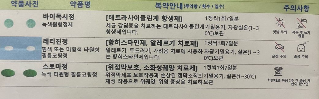 피부과 처방 약은 바이독시정, 레티진정, 스토마정입니다.
