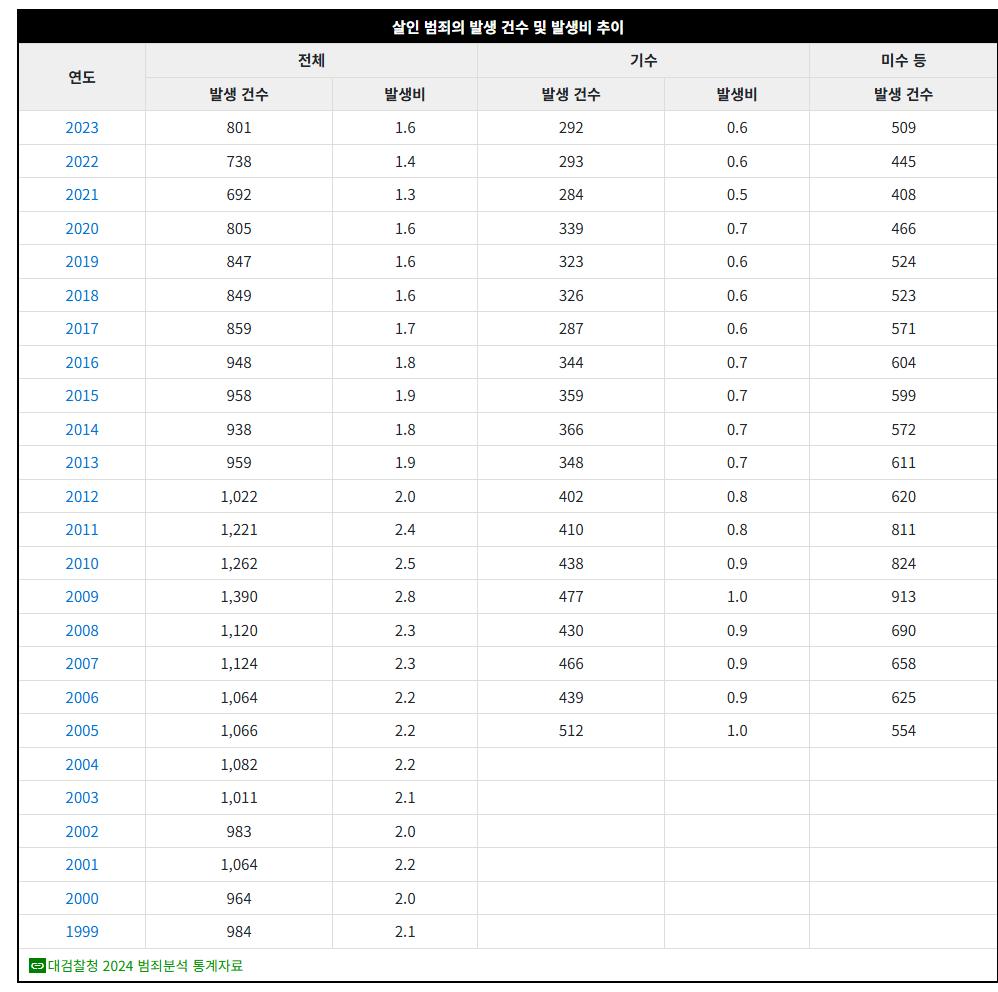 최근 경찰청 통계를 보면 한국의 연간 살인사건은 300~350건 수준에서 발생하고 있습니다 이제 OECD 국가들과 비교해보면 인구 10만명당 살인사건 발생률이 0.7건으로 매우 낮은 수준이에요 근데 살인사건의 80% 이상이 가족이나 지인 등 면식범에 의해 발생하는데 전혀 모르는 사람에 의한 무차별 살인은 극히 드문 편이라고 할 수 있습니다 유럽이나 미국은 연간 수천 건의 살인사건이 발생하는 것에 비하면 한국은 정말 안전한 국가라고 평가받는데 이는 총기 규제와 CCTV 설치 등 범죄 예방 시스템이 잘 갖춰져 있기 때문이에요 아 글고 살인사건 검거율도 95% 이상으로 매우 높은 수준을 유지하고 있어서 범죄 억제 효과도 크다고 봅니다..