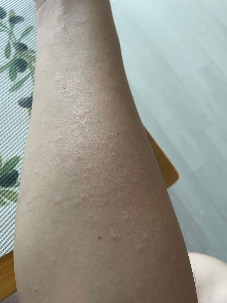 어떤 후기릉 보니 때르메스로 각질제거하고 바디로션 많이 바르면 된다고 해서 하고 잤더니 피부가 난리가 났네요... 이거 모공각화증 맞죠?? 때르메스로 괜히 각질제거 한거같네요 ㅠㅠ