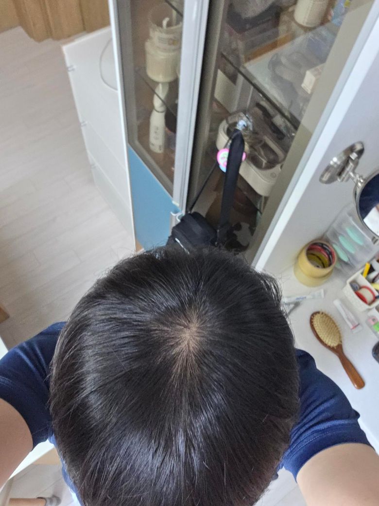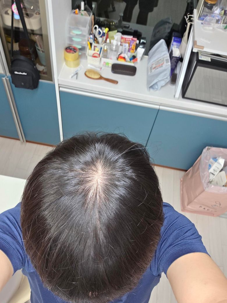 사진상 정수리 부위에서 두피 노출이 비교적 뚜렷하게 보입니다. 단순 가르마나 소용돌이 형태만으로 설명되기보다는 초기 남성형 탈모 가능성을 우선 고려하는 소견입니다. 다만 조명, 모발 젖음, 각도에 따라 과장되어 보일 수 있어 단일 사진만으로 확정 진단은 어렵습니다.