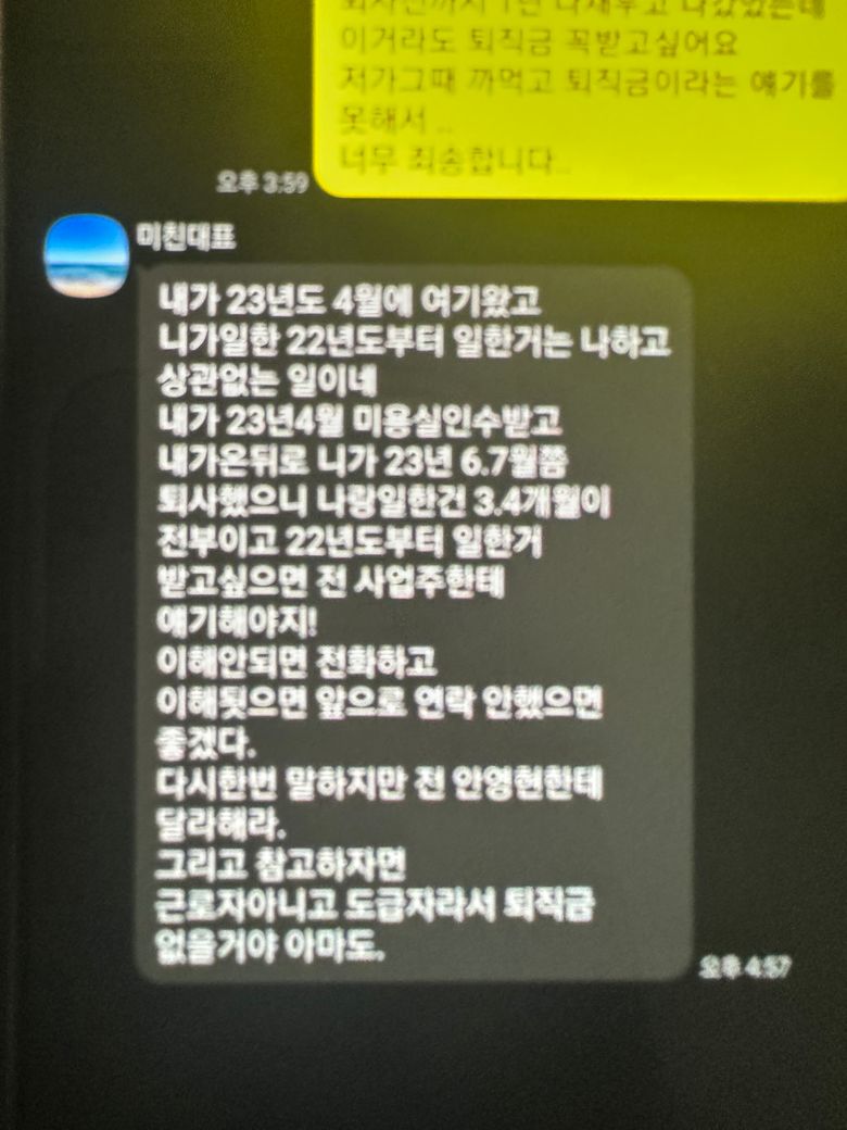 저가 전에 퇴사하고 1년 일햇던걸 퇴직금 얘기를 못해서 지금 대표한테 얘길하니까 이렇게 답이왓는데 전대표님한테 얘기하는게 나은건가요?