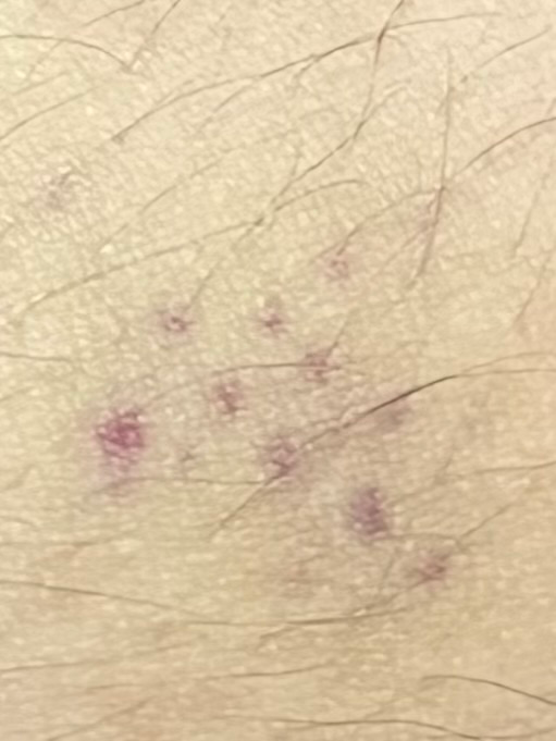 거친 각질층이 일어나 있는 듯 한 느낌이 없이 보라빛이고, 자색반이 만져질수도 안 만져질수도 있는 양상이라면, 자반증도 고려해 볼수는 있습니다. 모낭염으로 인한 색소침착, 건성에 관련되는 습진의 가능성도 있습니다.