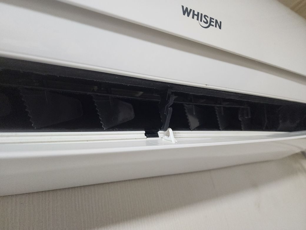 저 에어컨 하단 판부분에 가운데 고정하는 부분이 부셔져서 저렇게 수평이 안맞게 고정되어있습니다.