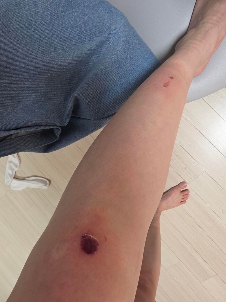 왼쪽다리 무릎 까지고 정강이도 파임 현상 있어서 물로 씻고 습윤밴드 붙여두었습니다. 어제 붙이자마자 거의 하얗게 부풀었는데요. 오늘 아침에 새 습윤밴드로 교체하여 붙였습니다.