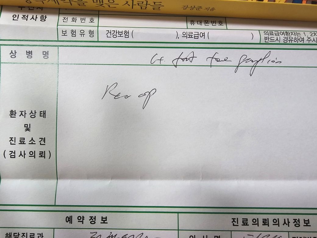 1명 평가워낙 알아보기 어려울 글씨체로 쓰여있긴 합니다만 상병명에는 Lt. foot toe ganglion, 진료 소견에는 Rec. op. 라고 적혀있는 것 같습니다.