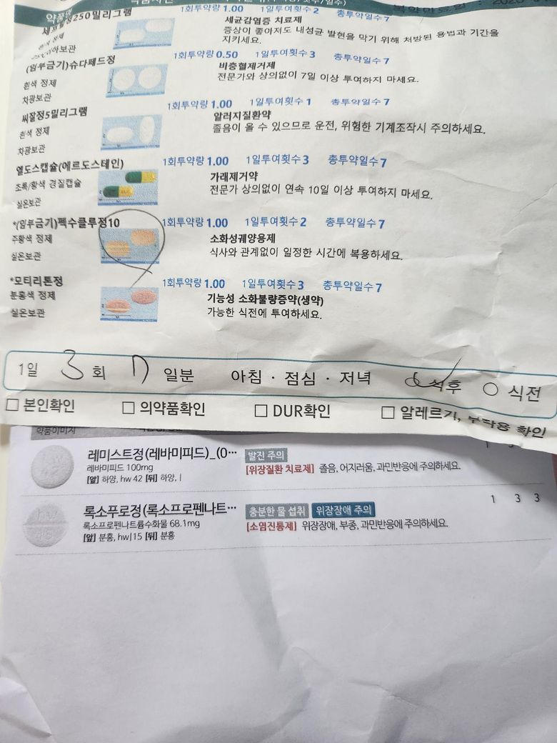 정형외과에서 레미스트정과 록소푸로정(아래 약봉지)