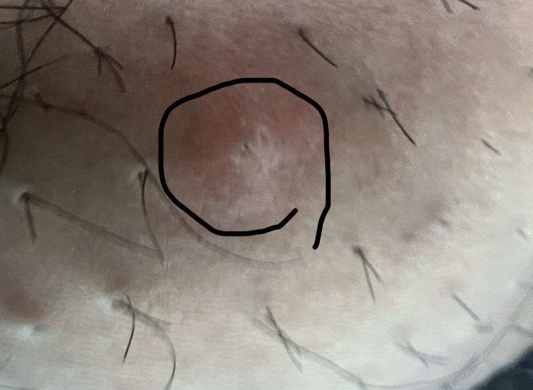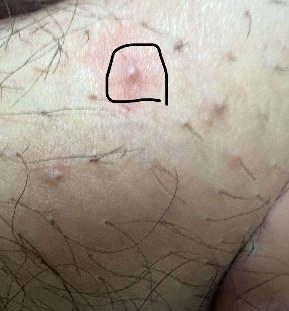 사진상 병변은 중심에 흰 농점이 보이고, 주변으로 국소적 홍반이 동반된 구진 형태입니다. 털이 자라는 부위이며, 핀셋으로 제모한 병력이 있다면 인그로운 헤어에 의한 국소 모낭염 가능성이 가장 높습니다.