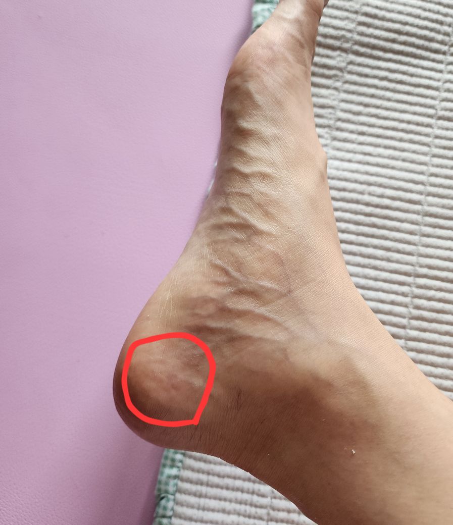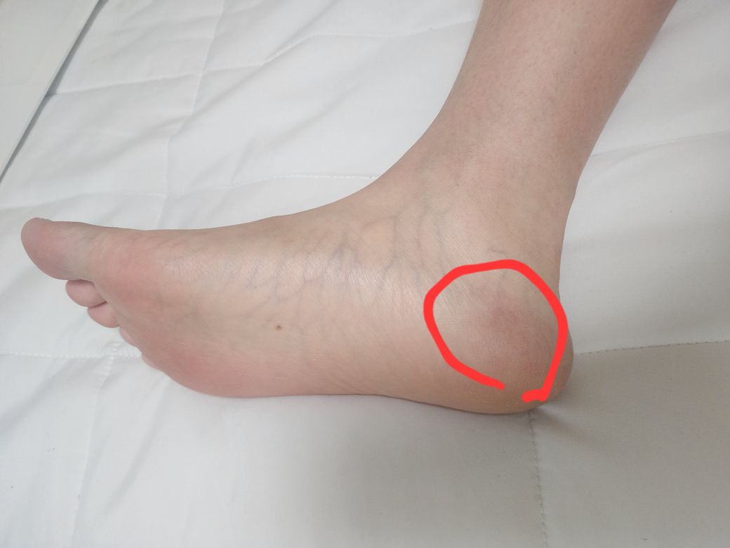 여러가지 원인이 있어보이지만, 우선 종아리 근육의 단축 이나 뭉침 여부를 확인해보시면 좋을거같습니다. 사진상의 부위는 아킬레스건이 붙는 지점인데 보통 저 부분의 통증은 종아리쪽 단축에서 발생하는 경우가 많습니다. 그리고 한쪽만 그런다면 틀어진 골반까지 의심해볼 수 있고여, 개인적으로 신경 눌렸거나 종아리 근육의 단축으로 보입니다.