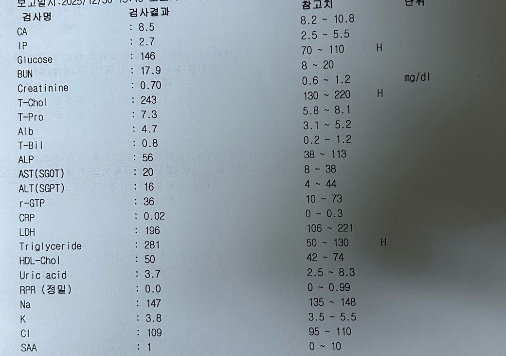 공복혈당 146도 정상 범위를 넘어 당대사 이상 가능성이 있어 지질 이상과 함께 심혈관 위험도를 높이는 요소입니다. 간기능, 신장기능, 염증수치는 전반적으로 정상 범위로 보입니다.