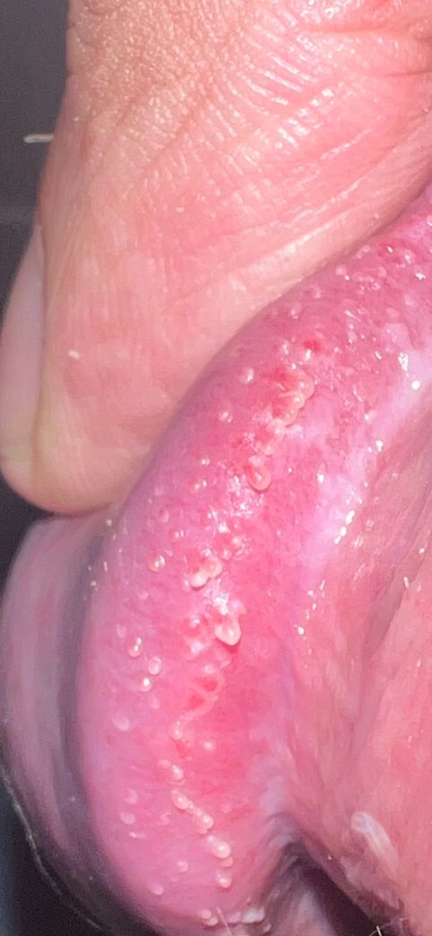 헤르페스2형 보유중입니다. 어제 관계중 통증이 조금 있어서 확인해보니 저런증상이 나타났습니다 진주양구진이 마찰로인해 비비다가 까진건지 아니면 헤르페스가 발병된건지 궁금합니다 원래 발병위치도 저쪽이 아니여서 걱정이되네여