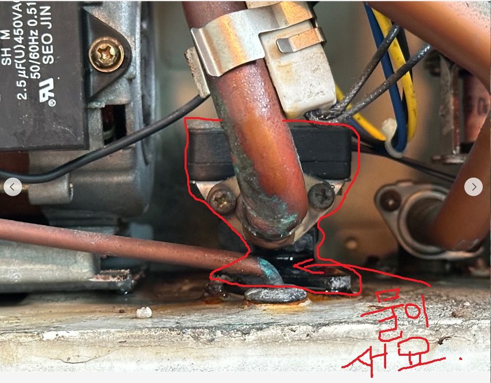 사진상 확인된 부분은 린나이 보일러 내부의 순환펌프 또는 3방밸브와 연결된 동관(구리 파이프) 부위에서 물 누수가 발생하고있는거 같습니다