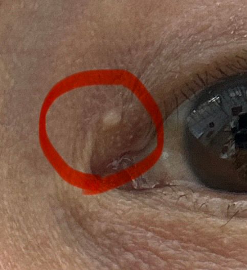 사진상 병변은 눈꺼풀 주름 아래에 작고 둥근 흰색 구진 형태로 보이며, 통증이 없고 서서히 생긴 점을 고려하면 비립종이나 작은 낭종 가능성이 가장 높습니다. 피지나 각질이 피부 안에 갇혀 생기는 양성 병변으로, 흔히 눈 주변에 잘 생깁니다.