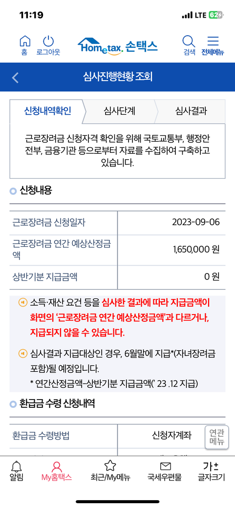 23년 9월 6일 자로 근로장려금을 신청 하였는데 아직까지도 못받은게 정상인가용?5월에 정기신청 할때 했는데 저는 이미 신청해서 안해도 된다고 나오면서 조회해보니 저렇게 나오는데 대체 언제 받는걸까요 ㅠㅠ