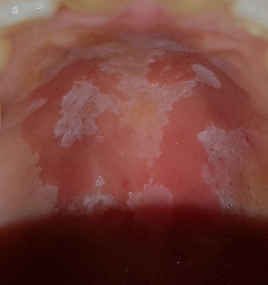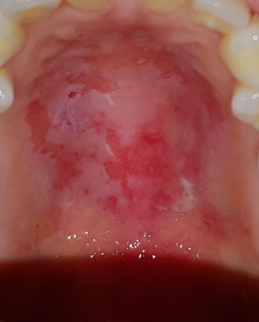 1.하얀막이 생긴 건가요? 아니면 있어야 할 하얀막이 벗겨져서 빨갛게 헐은 건가요? 하얀막이 생겨서 입천장을 덮어야 정상인지 아니면 없어지고 빨갛게 되어야 괜찮은 건가요?