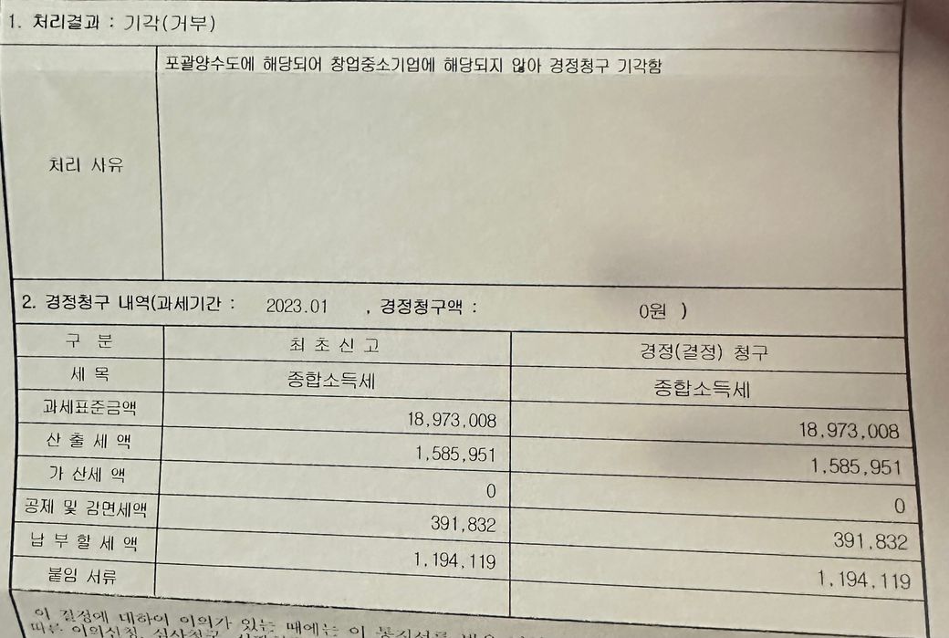 최초신고(24년 5월에 신고)시 이미 119만원을 납부했습니다(혹은 납부했어야 합니다). 추가납부할 금액은 없습니다. 창업감면에 대한 경정청구가 기각(거절)된 것입니다.