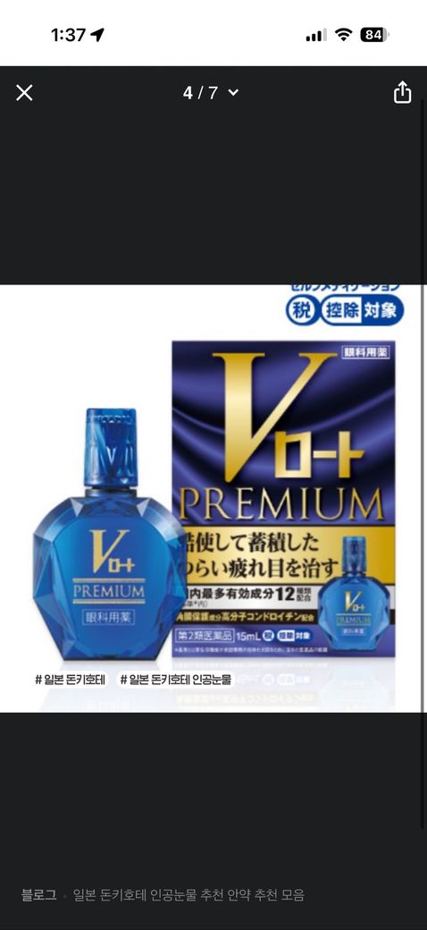 사진 제품은 일본 안약인 V 로트 프리미엄(V Rohto Premium)입니다. 이 제품은 일반적인 인공눈물 계열과 달리 혈관수축제, 비타민, 각막보호 성분 등이 복합적으로 들어간 피로·충혈 치료용 안약입니다.