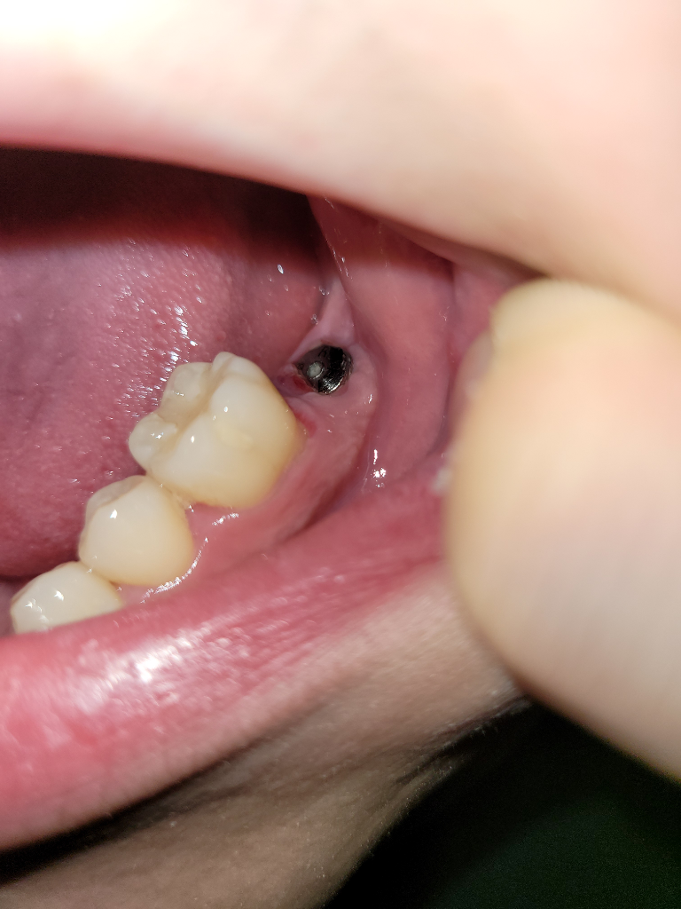 약간 잇몸이 덮힌 것은 아무른 문제되지 않습니다. 나중에 본 뜨고 임플란트 크라운 끼울 때 잇몸을 약간 누르면서 들어가니 괜찮습니다. 그냥두면 됩니다.
