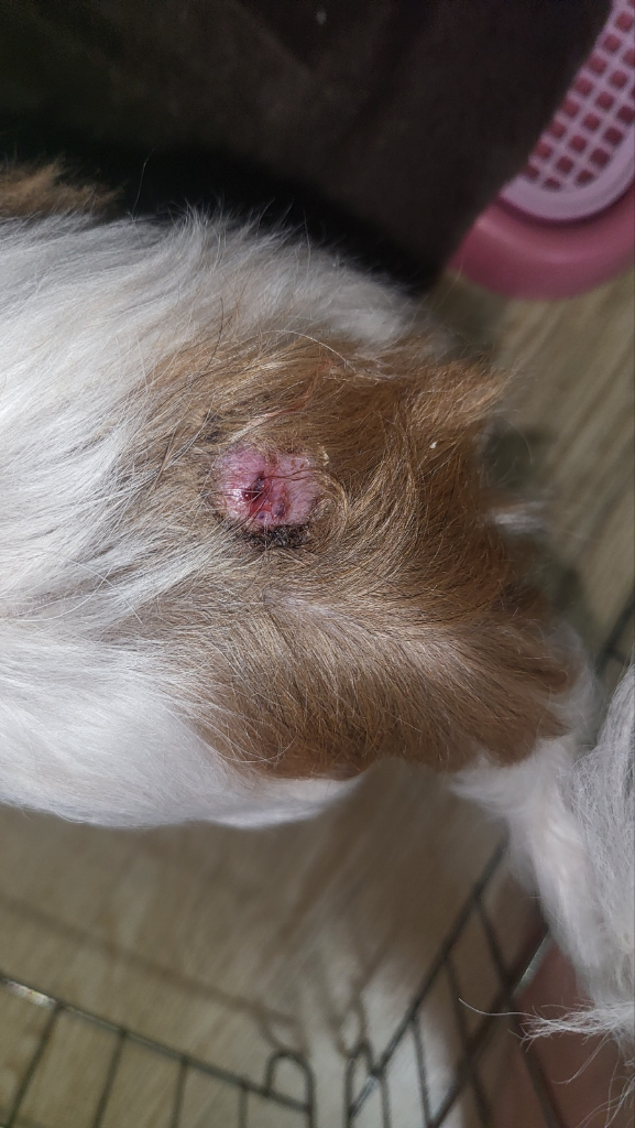 강아지 꼬리 윗부분에 밤톨만한 혹이 났고 피고름이 나온다고 합니다, 원래 작았어서 신경 안쓰다가 오늘 보니까 심해져 있었다하십니다 원래는 털이 덮고 있었는데 아버지가 털 잘라내고 사진찍어 보내주셨어요. 아직까지 강아지한테 다른 구토를한다던지 이상증세는 안 나타납니다 겉으로 보기엔 팔팔해요 하지만 언제 아파할지 불안합니다