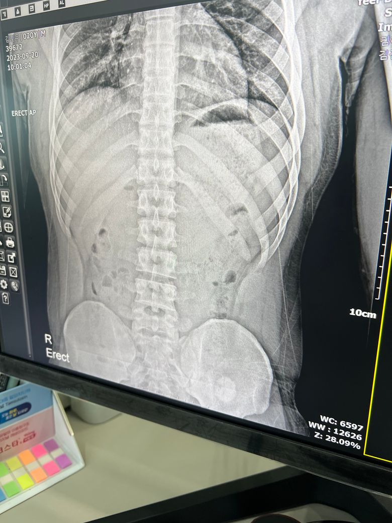 엑스레이 사진을 통해서 구체적으로 무엇인지 알 수 없습니다. 이상 소견이 발견된 만큼 정체가 무엇인지 정밀하게 파악해보아야 하며 CT, MRI 등 더 정밀 검사를 해보아야 할 것으로 사료됩니다.