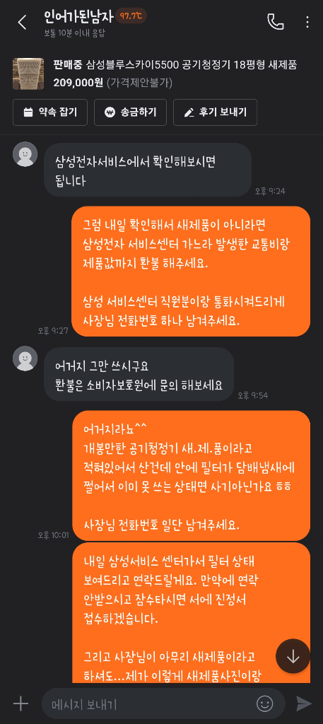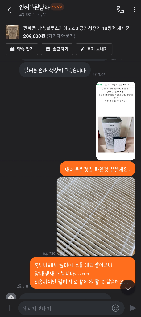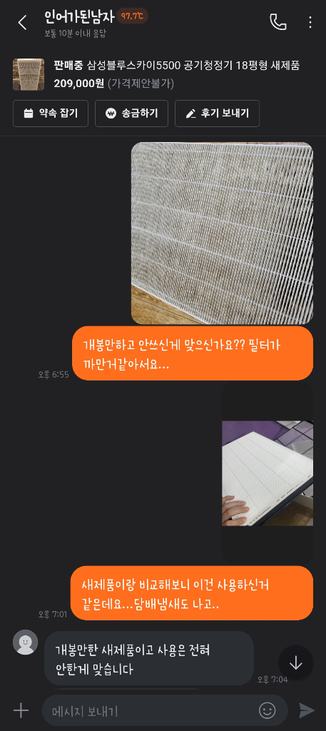 필터는 썩었는데 외관만 멀쩡하면 이게 새상품이라는 단어에 적합한건지..?? 싶네요. 대화내역이랑 제품사진을 증거로 해서 경찰에 사기죄로 신고했더니 증거불충분으로 사건이 종료됐더라구요...