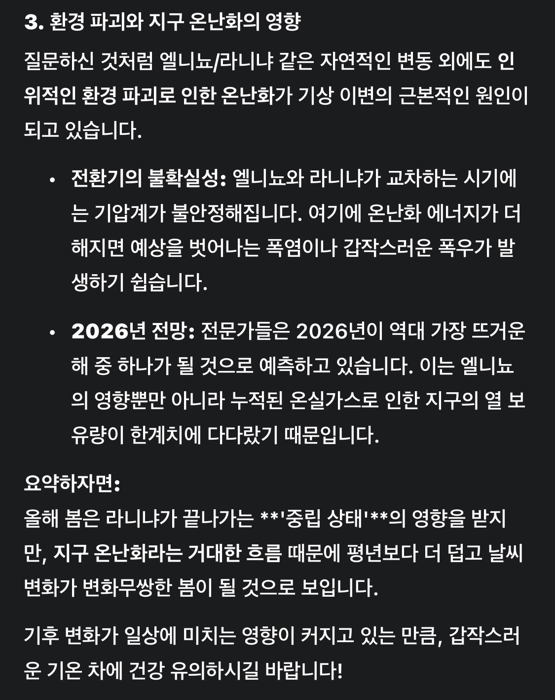 환경파괴로 인해 지구온난화 현상 발생하고 이는 사람들 살아가는 환경에 영향주고 있습니다. 2026년 올해 봄 기상이변에 해당하는 엘리뇨 또는 라니냐 영행 받는가요? 아니면 기상 변화로 인해 영향 받지 않는가요?